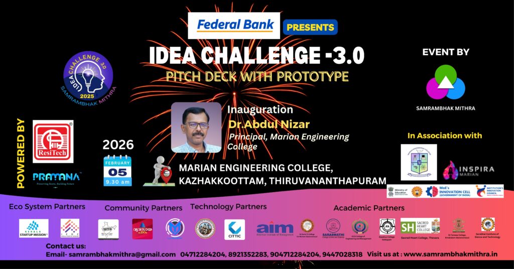 Pitchdeck VI under Phase II of Idea Challenge 3 .0 inaugurated by Smt. Mary Shini E R, CEO, Spice Wood, Thiruvananthapuram on 21st October 2025 at 11 am at LBS Institute of Technology for Women. Prof Dr. Smithamol M B, Principal of the college presided over the function. Dr. Balan K, Former Prof Govt Engineering College, Vice resident Indian Chapter of International Geosynthetics Society and Chairman Judging panel of Idea Challenge 3.0 delivered Key Note Address. Sri. Samuel Mathew, Secretary Samrambhak Mithra delivered the welcome address. Students from Thiruvananhtapuram and Kollam distrct pitched Ideas. Judging panel members Dr. Gireeshan M G, Sri Francis EJ, Sri Pradeepkumar and Dr. Balan K evaluated the pitching. Programme concluded at 3.30 pm.